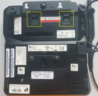 Turn over the VeriFone device. Push lightly on the grooves marked in yellow in the image below and remove the module from the device.