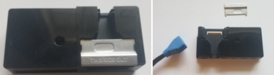 - When the blue connector is attached, replace the metal clip with the "this side out" text facing outward.